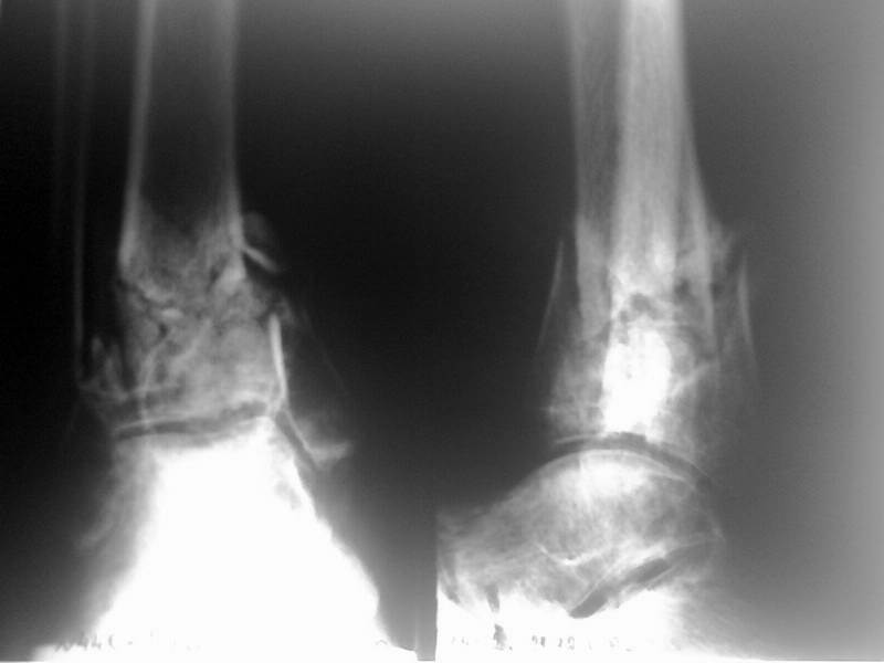 На операции - несращение проксимального диафизарного отломка и осколков эпифиза, которые представляли собой неправильно сросшийся, крепкий конгломерат. С учетом сохранности движений в голеностопном суставе (боясь ему навредить), решено было не разбирать их, а только исправить ось голени, что и было сделано, после остеотомии и резекции малоберцовой кости + остеопластика.