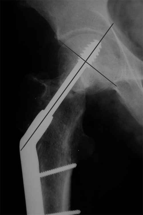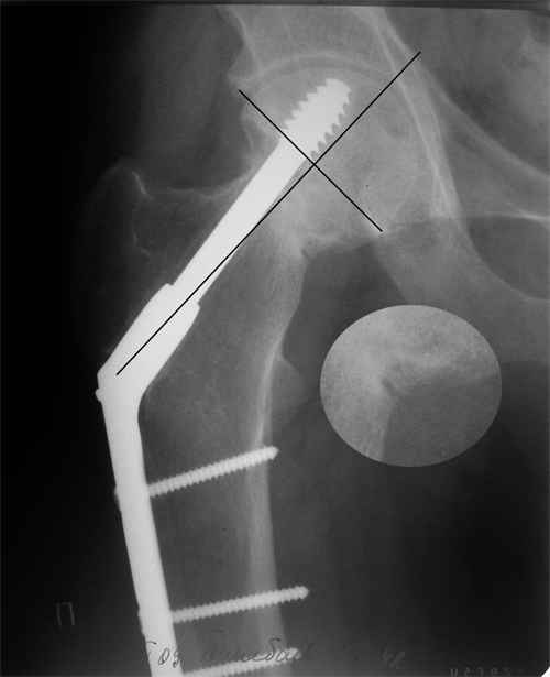Но в данном случае DHS сыграл как имплант с угловой стабильностью, что привело к прорезыванию импланта в верхнем сегменте головки. Отсутствие трехточечной опоры и длинный имплант увеличивают нестабильность в шейке.