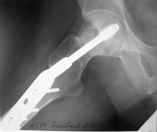Больной Т. 1966 г.р.Травма 28.06.2007. Прооперирован в г. Бишкек, Оп: Остеосинтез правого бедра системой DHS. В последующем беспокоили периодические боли в правом тазобедренном суставе с иррадиацией в коленный сустав в область передней поверхности правого бедра. Лечился амбулаторно с незначительным эффектом. В 07.04.2008 по 08.05.2008 года лечился в госпитале ГУВД и СО в стационаре с Срастающийся перелом шейки правого бедра в условиях фиксации системой DHS – боли уменьшились.Боли обострились 03.02.2009 внезапно, госпитализирован. Результат - Псевдоартроз шейки правого бедра (имеются косвенные признаки разрушения спонгиозной части головки бедра)Планируется - Работает милиционером. Имеющийся опыт протезирования у данной категории во всех случаях в ближайшее время заканчивался дисквалификацией. Работоспособный возраст (43 года).Наиболее приемлемым и реальным методом лечения предполагается: Удаление конструкций из бедра. Заполнение полости от винта монолитным аутотрансплантатом из крыла (крылев) подвздошной кости. Медиализация большого вертела. Предполагаемый период нетрудоспособности 3-4 мес.