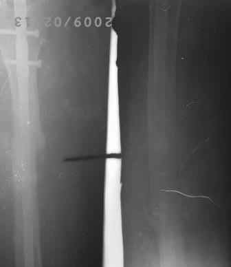 12.02.09г б-ная оперирована: з/остеоклазия (без особого труда- видимо тугой ложный сустав) коррекция деформации, удаление штифта из надвертельной обл, рассверливание канала гибкими развертками, реостеосинтез блокируюшим гвоздем Д-11мм.