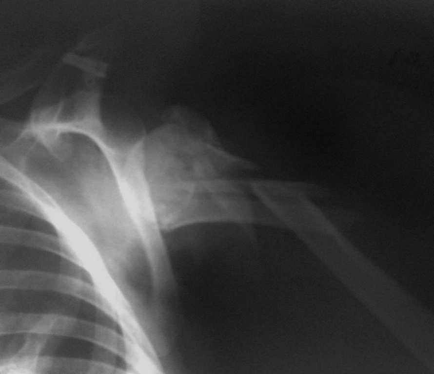 Александр, наверное низкое качество снимков вас дезориентировало. Имеет мество перелом головки плеча на уровне анатомическойт шейки, со смещением большого бугорка.Конечно, теоритически можно(по типу PFN) реконструировать проксимальный отдел плеча...... я склоняюсь к протезированию на ревизионной ножке(200мм) с синтезом отломков(осколков)серкляжом на ножке протеза...........