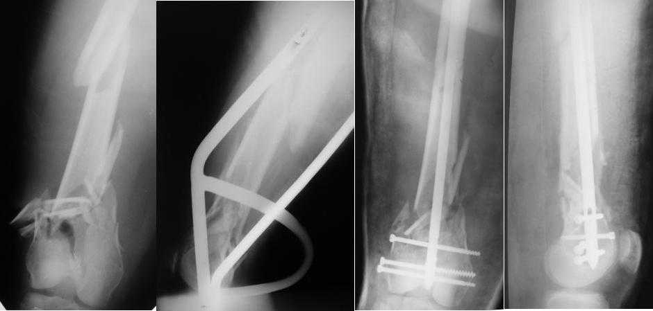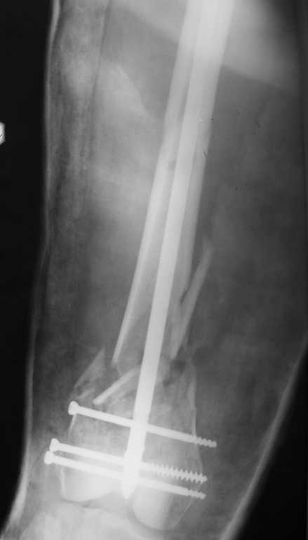 В данном клиническом случае мы бы использовали ретроградный остеосинтез универсальным штифтом (СХМ) при этом дистальный метафиз зафиксировали 2-мя болт стяжкой (спец. блокирующим набором).