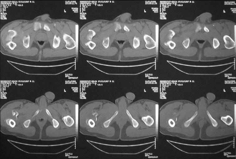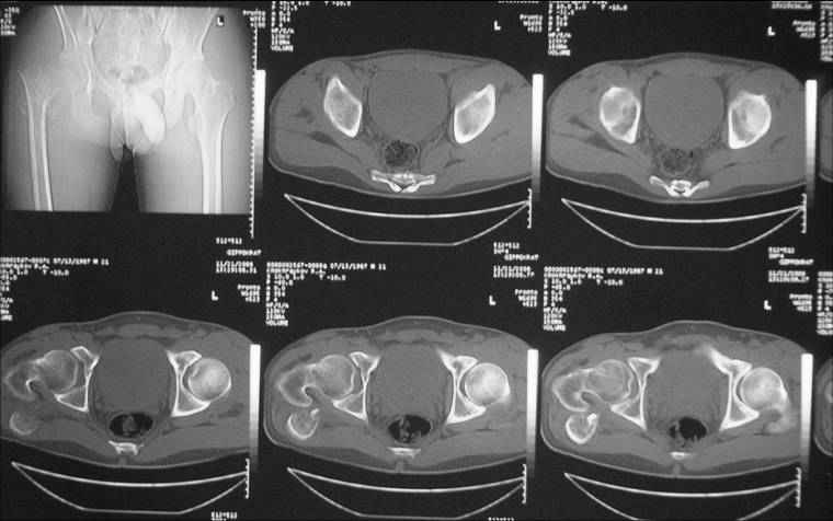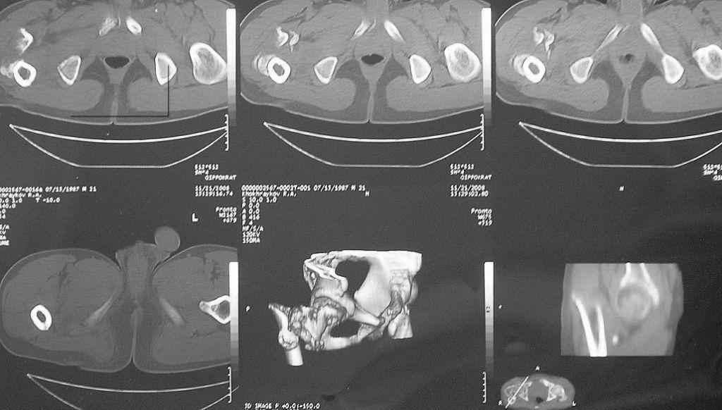 Травма 8 мес. назад, ДТП, получил закрытый межвертельный перелом правого бедра. Лечился в городской больнице одного из городов-спутников г. Караганды скелетным вытяжением в течение 3 недель, затем кокситной гипсовой повязкой 2 мес. В настоящее время имеется укорочение конечности на 7 см, умеренная боль в вертельной области; ходит без костылей, полностью нагружая больную конечность, при нагрузке отмечается смещение дистального отломка проксимально примерно на 1,0 см.; объем движений в коленном суставе сохранен; при пальпации отломков боли нет, умеренная патологическая подвижность. Планируем внеочаговый остеосинтез спице-стержневым аппаратом, дистракция до восстановления длины бедра, вторым этапом остеосинтез стержнем Гамма. Есть надежда, что на дистракции пойдет сращение и у больного хватит терпения завершить лечение в аппарате.