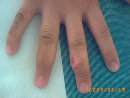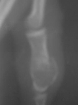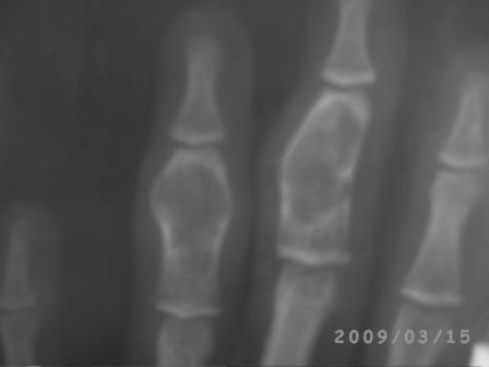20.03.09г. операция. Экскохлеация не получилось, стенки диафиза фаланги как папиросная бумага, хотел сохранить хоть одну стенку, но и это не получилось - ломается и крошится, удалось сохранить оба эпифиза, проксимально чуть стенку и метафиза. В полости белесоватая кашицеобразная масса. Дефект заполнен сформированной под фалангу аутопластикой из гребня подвздошной кости, сверху ушита надкостницей, пальцевые сосуды сохранены. Материал отправлен на гистологию. Фикация спицей трансартикулярно, вынужденно фиксировали оба сустава - но это мне никак не нравится!
