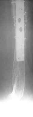 Уважаемые коллеги! На консультации больная 65 лет. С одной рентгенограммой - рис.1. Анамнез: 30 августа перелом левой плечевой кости, невропатия лучевого нерва - кисть повисла сразу. Лечение по месту жительства - иммобилизация косынкой. 2 октября в одной из больниц города металлоостеосинтез. Все развалилось. 16 октября - повторная операция, через десять дней - картина на рис.1. Далее металлоостеосинтез с костной аутопластикой малоберцовой костью 9 февраля 2009г. Снимки 2-4 выполнены сегодня. Считаем, что шансов на приживление и перестройку такого трансплантата в данной ситуации нет. Нестабильность запрограммирована и вываливание этого всего дело ближайшего будущего.Вопросы для обсуждения: 1. Кто-нибудь считает, что надо оставить "как есть"? Аргументы? 2. Если оперировать, то что выбрать: - фиксация пластиной с угловой стабильностью с ревизией нерва; - блокированный остеосинтез; 3. Что делать с трансплантатом - удалить - измельчить и оставить - не трогать, попытаться "нанизать" на гвоздь закрыто. Юрий Алексеевич Булахтин