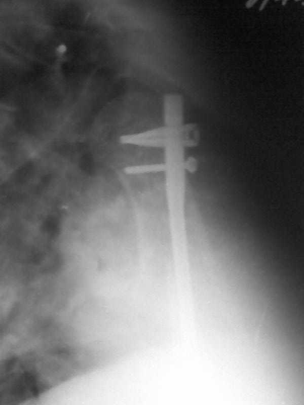 Приношу свои извинения по поводу рентгенорграмм! На сайт пищу первый раз. Отсылаю рентгенограмму в боковой проекции. Пациентка тучная, поэтому "пробить" ее и добится идеальных рентгенограмм не получается! Да, на снимке головка срезалась, но проблема не в ней (с головкой-то все как раз хорошо), беспокоит стояние костных отломков ниже головки... Хотя бы на основании тех рентгенограмм, которые имеются, можно получить комментарии. СПАСИБО!!!