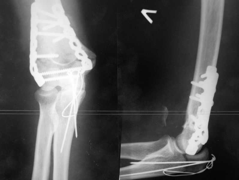 Оперирована по методике АО, после операции максимально рано начала заниматся ЛФК. В настоящее время основная жалоба пациентки на ограничение сгибания в локтевом суставе. Клинически объем движений: сгибание 90 градусов, разгибание 170 градусов, ротационные движения в полном объеме. Привожу снимки сразу после операции и через 2 месяца. (На рентгенограммах после операции в мягких тканях по передней поверхности плеча имеется небольшой костный фрагмент, но его ширина во фронтальной плоскости не более 1 мм., обнаружен был по снимкам после операции. Интраоперационно основные крупные фрагменты отрепонировались хорошо, объем движений был сгибание до 75 градусов, разгибание 175 град.)
