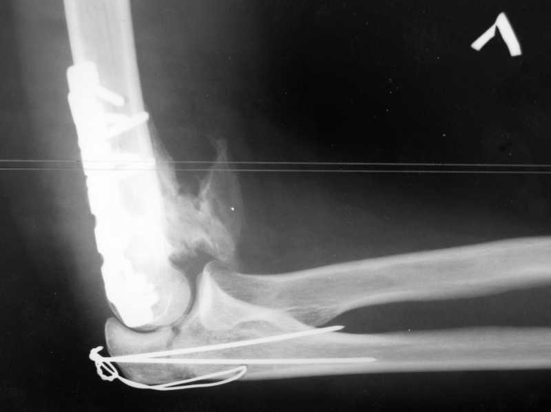 У пациентки 42 лет после операции остеосинтеза чрезмыщелкового перелома плеча, выполненной в нашей клинике 2 месяца назад, на контрольных R-граммах имеется гетеротопический оссификат по передней поверхности плеча.