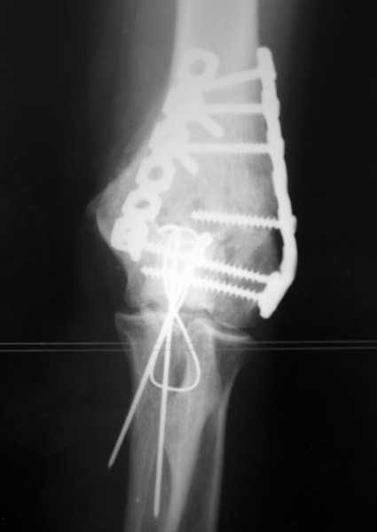 У пациентки 42 лет после операции остеосинтеза чрезмыщелкового перелома плеча, выполненной в нашей клинике 2 месяца назад, на контрольных R-граммах имеется гетеротопический оссификат по передней поверхности плеча. Оперирована по методике АО, после операции максимально рано начала заниматся ЛФК. В настоящее время основная жалоба пациентки на ограничение сгибания в локтевом суставе. Клинически объем движений: сгибание 90 градусов, разгибание 170 градусов, ротационные движения в полном объеме. Привожу снимки сразу после операции и через 2 месяца. (На рентгенограммах после операции в мягких тканях по передней поверхности плеча имеется небольшой костный фрагмент, но его ширина во фронтальной плоскости не более 1 мм., обнаружен был по снимкам после операции. Интраоперационно основные крупные фрагменты отрепонировались хорошо, объем движений был сгибание до 75 градусов, разгибание 175 град.) Пациентка неудовлетворена объемом сгибания, хотя была предупреждена о высокой вероятности ограничения движений. Профилактика гетеротопической оссификации (прием индометацина) не проводилась, т.к. имелась язвенная болезнь, да и эффект от его приема считаю сомнительным. Вопросы: 1.Стоит ли вмешиваться и пытаться удалить экзостоз? Если да,то в какие сроки и каким доступом лучше идти? 2. Оставить все как есть? 3. Не поможет ли ударно-волновая терапия либо какая-то другая методика? Буду благодарен за все ответы и оценки своей работы. С таким осложнением столкнулся впервые.