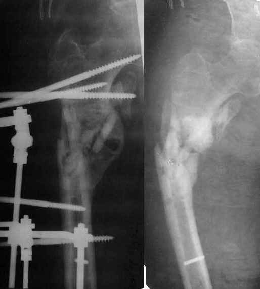 Неудачный остеосинтез пластиной: поломка винтов, миграция фиксатора. После удаления пластины сформировался гипопластический ложный сустав нижней трети бедренной кости, укорочение н/к 5 см. Выполнялся дистакционный остеосинтез аппратом Илизарова на штифте. Зона ложного сустава "не открывалась". Через 10 месяцев, когда даже регенерат полностью перестроился, консолидации в зоне ложного сустава не наступило, несмотря на стабильную фиксацию и постоянную компрессию(штифт+аппрата на 4 кольцах).