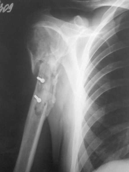 Более года назад пациент был оперирован в одном из НИИТО. При контрольном осмотре через год: болевой синдром, контрактура в локтевом суставе, патолгическая подвижность нижней трети плеча