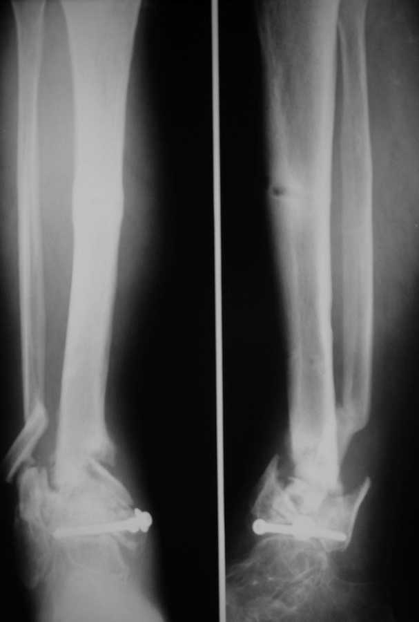 Со слов больного год лечили аппаратом, винты ввели при ПХО, потом ещё год ходил в гипсовой повязке.Сейчас ложный сустав в н/3, патологическая подвижность при попытке опоры.Наш вариант лечения: резекционная остеотомия малоберцовой, удалить винты,остеосинтез стержнем с рассверливанием и блокированием через пятку, естесственно с артродезом.Кожа чистая, хотя и в рубцах. Или опять аппарат?
