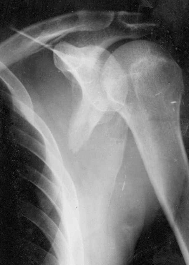 На рентгенограмме перелом латерального края правой лопатки с таким смещением. На других рентгенограммах перелом обеих малоберцовых костей и левой локтевой кости без смещения, множественные ушибы тела. В 2006 году ЧМТ, наблюдается у невролога и психиатра. Находился в РАО. Пока ведётся консервативно на отводящей шины без вытяжения. Какой метод лечения и почему для больного применить?