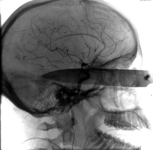 При поступлении в сознании, жаловалась на неприятные ощущения в глазнице. По протоколу сделаны все необходимые исследования: рентген, ангиограмма с 3Д реконструкцией, где обнаружили что все жизненно важные сосуды не задеты, даже некоторые "сидят" изгибаясь на ноже. Одним махом нож удалить не удалось, пришлось раскачать и потом двумя руками удалили нож. Рана без кровотечения, обработана и зашита. Djoldas Kuldjanov, MD Department of Orthopedic Surgery St. Louis University Medical Center