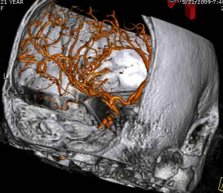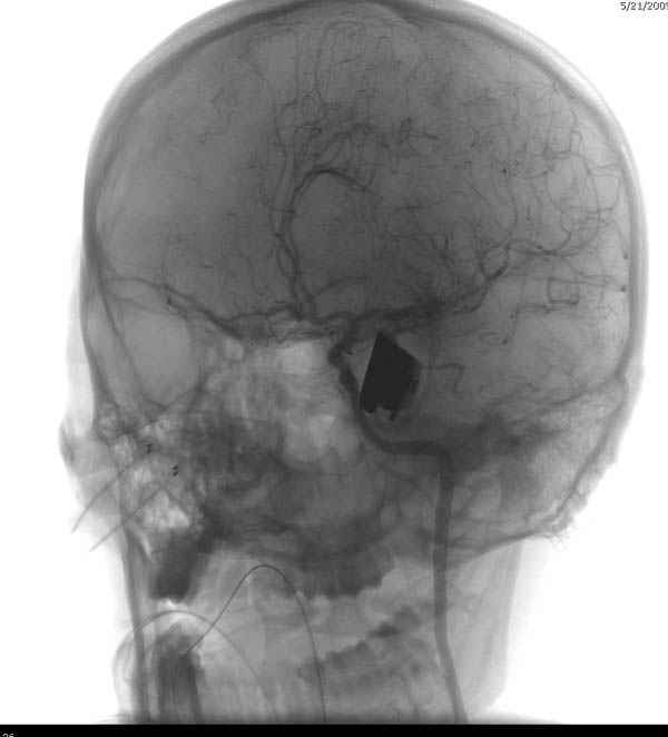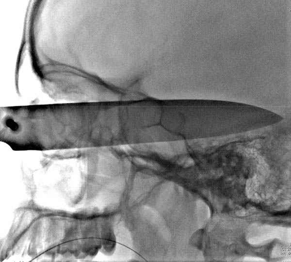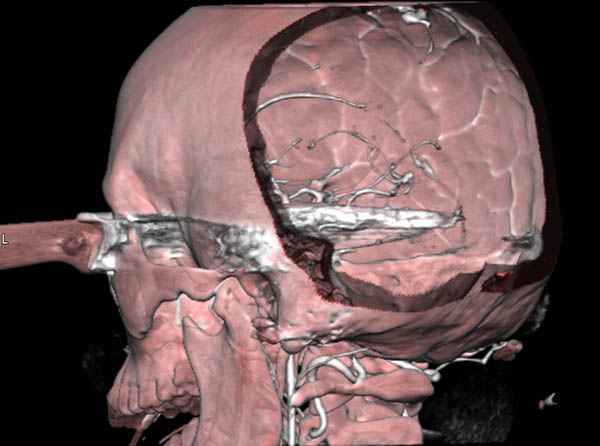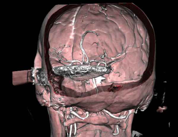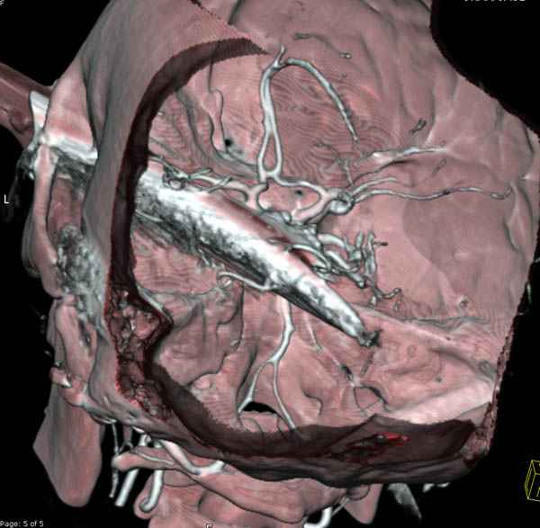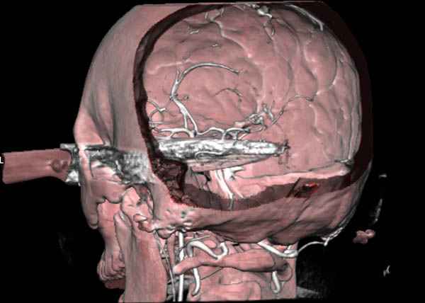Отличный пример современного подхода к проблеме.Проиллюстрированы все технические и материальные возможности, которые позволили врачам безопасно удалить нож.30 лет назад был подобный случай - доставлен пациент с ножом в правой височной области, в проекции a.meningea media,длина лезвия до 6 см.Мнения молодых врачей разделились, от простого удаления ножа в операционной до трепанационной ревизии височной зоны.Заведующий отделением просто выдернул нож в перевязочной, назначил ПСС и пенициллин.Через 7 дней пациент без дефекта был выписан.
