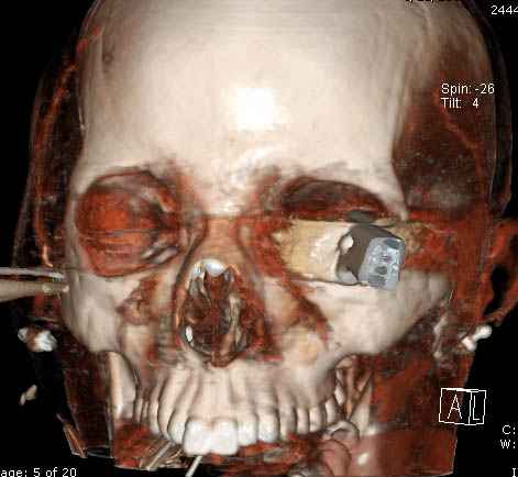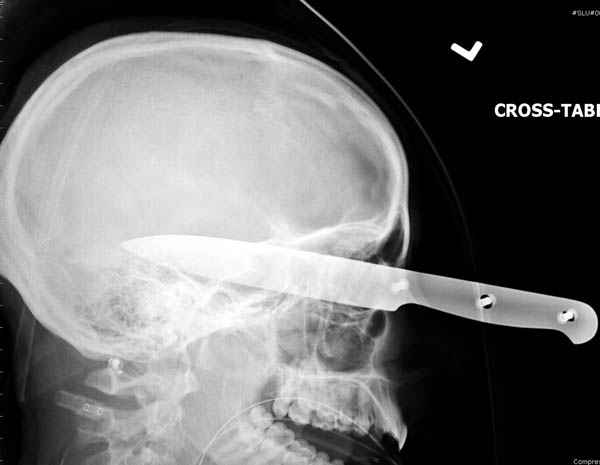 Уважаемые коллеги,Основную массу ургентной травмы в крупных городах Америки оказывают в центрах Травмы Первого Уровня. Ну не так как в популярных телесериалах типа "Emergency Room", но общая атмосфера похожая, где кроме травмы скелета принимаются все остальные ургентные случаи. В своих выступлениях я рассказывал, что наши центры в мирное время по пенетрирующим травмам не уступает Ираку или Афганстану, и вот недавно к нам поступила больная 22 лет, травма "ножом в глаз" от бывшей подруги нынешнего "бой френда". При поступлении в сознании, жаловалась на неприятные ощущения в глазнице. По протоколу сделаны все необходимые исследования: рентген, ангиограмма с 3Д реконструкцией, где обнаружили что все жизненно важные сосуды не задеты, даже некоторые "сидят" изгибаясь на ноже. Одним махом нож удалить не удалось, пришлось раскачать и потом двумя руками удалили нож. Рана без кровотечения, обработана и зашита.