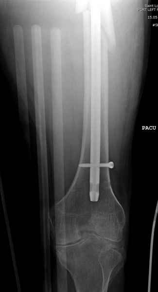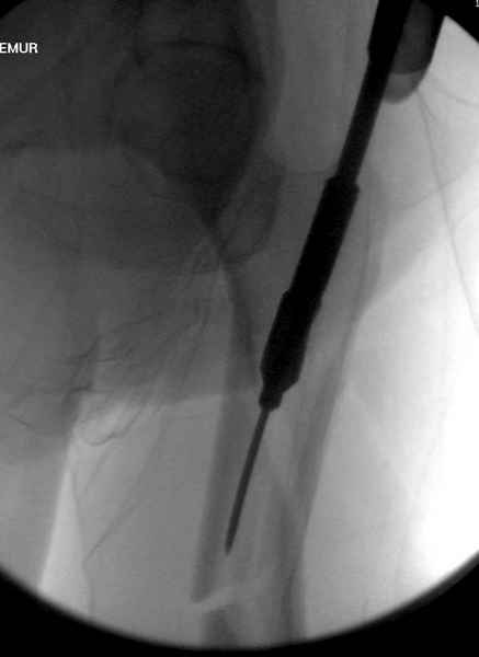 Учитывая, что случай ургентный, больной поступил вечером, не стали делать вытяжение и срочно провели операцию по фиксации перелома бедра антеградным штифтом Versa Nail от DePuy.