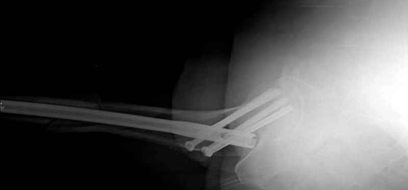 Для профилактики дальнейшего раскола в шейке предварительно во время проксимального рассверливания спереди и сзади провели временные спицы, которые в дальнейшем были заменены на шурупы (miss nail method)