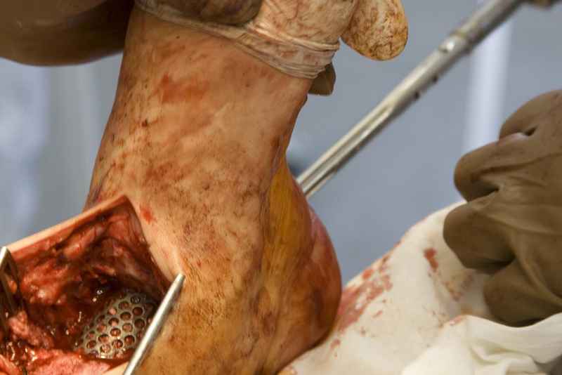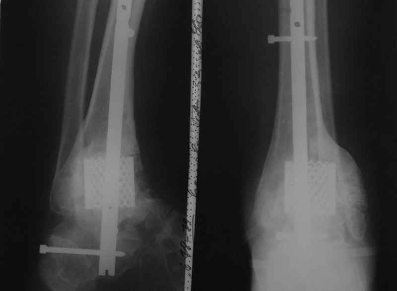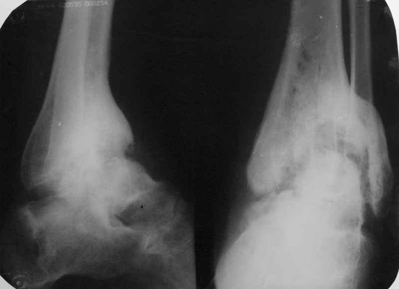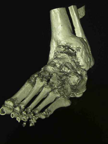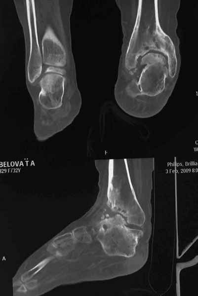 Пациентка Б. получила травму 2001 году в результате падения с высоты. За это время дважды выполнялись неудачные попытки артродезирования голеностопного сустава. Больная перед нами поставила одну задачу - восстановить опороспосонбность левой нижней конечности и только. Принято решение выполнить кейдж-артродезирование левого голеностопного сустава блокируемым интрамедуллярным гвоздем с установкой сетчатого опорного трансплантата, костной аутопластикой плюс Chronos. С целью профилактики рецидива деформации выполнили ахиллотомию (считаем, что неудачи предшествующих операций связаны с варусной тягой ахиллова сухожилия в ррезцльтате неправильно сросшегося перелома пяточной кости). На сегодняшний день - два месяца с момента операции. Пациентка перемещается в циркулярной повязке с полной нагрузкой на больную ногу. Примите наши радушные поздравления Анатолий Федорович.