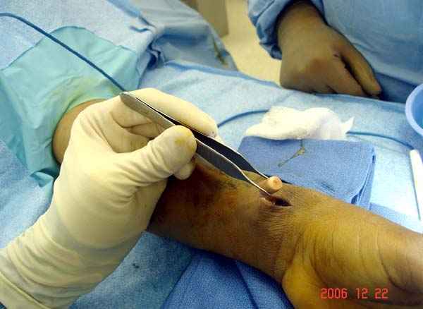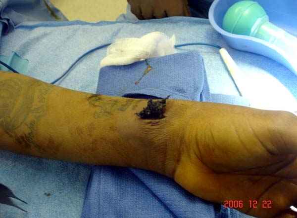 Обработку входного и выходного отверстия от пули проводили обычным способом: на уровне канала "кюретажем" и без агрессии в зоне перелома. В пользу такой обработки: Проспективные рандомизированные клинические исследования показали I&D против обработки, где из 163 ОСР у 89 сделаны I&D, а 74 просто обработку без иссечения, в заключении 4 инфекции в первой и 2 инфекции во второй консервативной группе