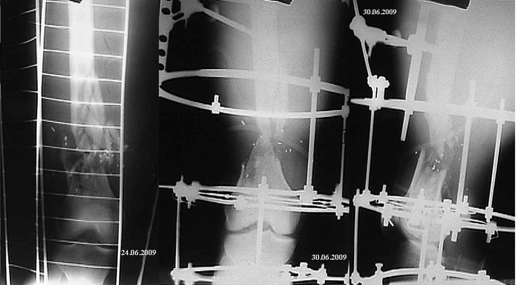 В последующем, почти все случаи конвертировались во внутренние фиксаторы - пластины или интрамедуллярные. Исключения были в тех случаях, когда было невозможно добиться адекватной фиксации из-за локализации линии перелома, например, при низких экстраартикулярных переломах голени. Такие переломы фиксировали с помощью аппарата Илизарова и для стабильности вводили множество спиц в дистальном отделе.