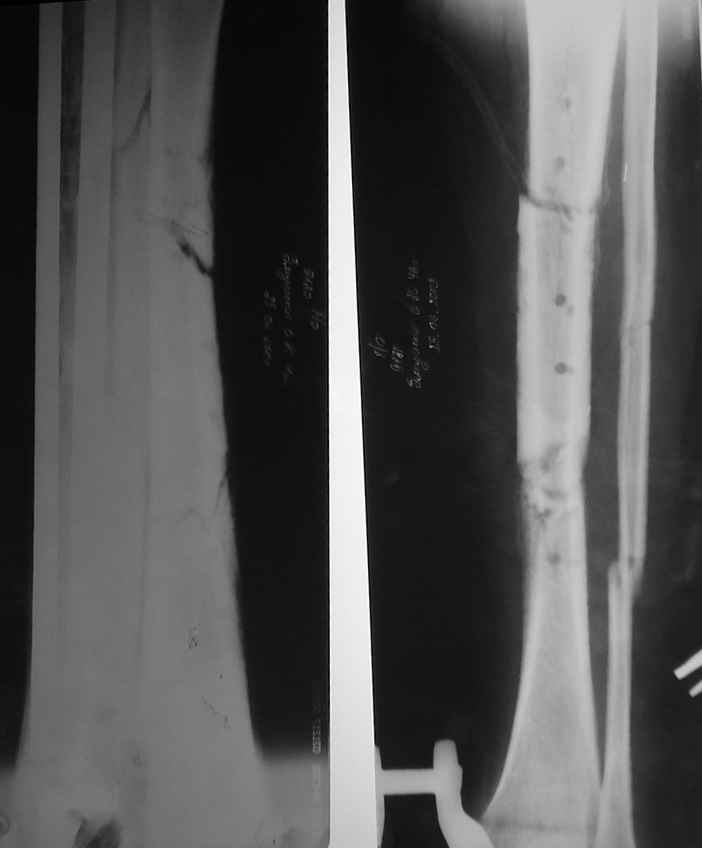 В настоящее время целостность мягких тканей голени полностью восстановлена, кожные лоскуты на мышце розовые фиксированные, раны закрыты на 100%, больной активен, ходит на костылях с дозированной нагрузкой на ногу в аппарате. Планируем выписать его на месяц по месту жительства. И если не получится с Минском, сделаем ему как и планнировали что-то вроде операции Гана-Кодивилла-Геттингтона. Пациент заранее настроен на длительное лечение в аппарате Иллизарова, уже хорошо адаптирован,оптимистичен и пока очень доволен результатами, отмечает значительное улучшение самочувствия. В приложении высылаю фотографии рентгенограм до и после операции.
