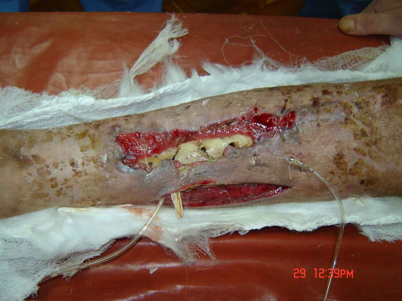 Пациент 42 лет около 3-х месяцев лечился на районе с открытым двойным переломом большеберцовой кости на границе верхней и средней трети и на границе нижней и средней трети,двойным переломом малоберцовой кости. Прооперирован на районе в день поступления- произведен остеосинтез перелома большеберцовой кости металической пластиной. В послеоперационном периоде некроз краёв раны по передней поверхности голени, нагноение, остеомиелит. Была попытка свести края раны путём нанесения послабляющих разрезов по боковым поверхностям голени.При поступлении в наш центр у пациента обширная рана передней поверхности голени с дефектом мягких тканей, в ране на большом протяжении обнажена нежизнеспособная тусклая большеберцовая кость, в том числе зона перелома. Отделяемое из раны гнойное с неприятным запахом. На операции после резекции осцилирующей пилой передней поверхности обнажённой части большеберцовой кости, в костно-мозговом канале большое количество гноя, задняя поверхность большеберцовой кости тусклая. Некрэктомия и остеосеквестрэктомия, из костно-мозговых каналов оставшихся верхнего и нижнего отрезков большеберцовой кости умеренное кровотечение. Произведена транспозиция мышечного лоскута передней большеберцовой мышцы на ветвях передней большеберцовой артерии в область ложа большеберцовой кости, мышцей закрыты верхний и нижний отрезки большеберцовой кости. На мышечное ложе уложены свободные расщеплённые мышечные лоскуты, взятые с правого бедра. Произведен стабилизирующий остеосинтез правой голени спицами,фиксированными и натянутыми в аппарате Иллизарова. В послеоперационном периоде лоскуты хорошо фиксированы, рана чистая, по дренажам скудное отделяемое геморрагического характера. Дренаж сегодня удалил. Планируется после полного востановления кожного покрова и консолидации перелома малоберцовой кости, транспозиция и фиксация последней на область дефекта большеберцовой кости. Одномоментно побоялись сделать такую оперцию из-за риска развития остеомиелита малоберцовой кости, так как оперировали на фоне выраженных гнойных осложнений.Фото прилагаю.С уважением, Цветков Евгений.