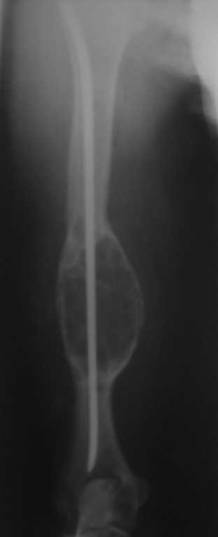 Уважаемые коллеги! 3 года назад оперирована пациентка по поводу патологического перелома плеча на фоне костной кисты. Выполнен ЗИО плоским титановым стержнем. Спустя 1,5 года на фоне сросшегося перелома выявлен рост опухоли, подозрение на малигнизацию. Консультирована онкологами, те пациентку своей не признали, биопсия не проводилась. Биопсия выполнена в июне 2009, по заключению одного учреждения - костная киста, по другому - хондросаркома. Обследована, отдаленных метастазов нет. Вопросы: Диагноз? Варианты лечения? Может резекция в пределах здоровой кости, каркасная металлопластика плюс гвоздь? Спасибо.
