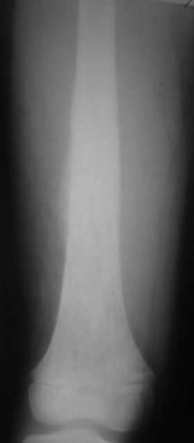 Судя по представленным снимкам, нужно подумать о саркоме Юинга, так как Остеогенная саркома редко поражает диафиз трубчатых костей. Ее излюбленно место - метаэпифиз.