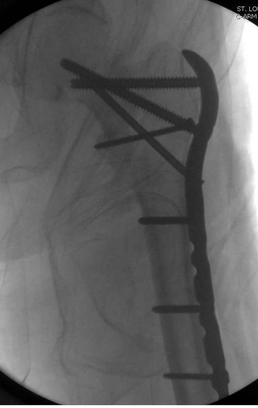 Из фиксаторов, мы бы применили цефаломедуллярные, потому что они "по закону моментов" из-за короткого рычага от центра головки к диафизу и по принципу "головка диафиз" механически лучше выдерживают нагрузки, чем пластины.
