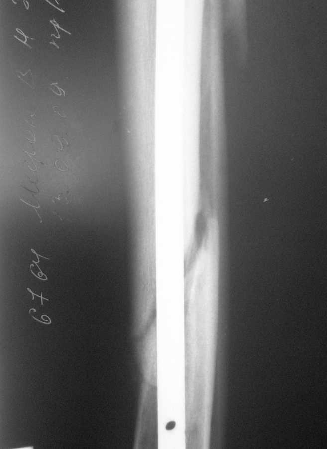 В настоящее время - через 9 месяцев с момента операции периодически в вечернее время беспокоят ноющие боли в места перелома (не постоянно). При беседе выяснено, что боли чаще беспокоят после того, как днем она походит по дому без трости. Пальпаторно по гребню берцовой кости болей нет, но по задне-внутренней поверхности б\б кости пальпирутеся западение на уровне места перелома.
