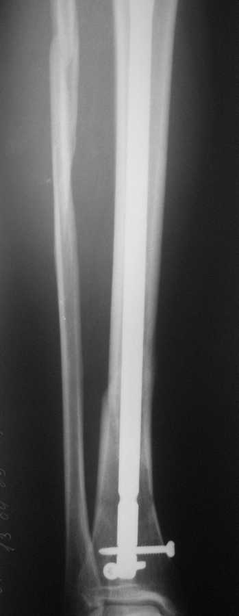 По снимку гвоздь сидит плотно в узкой части большеберцовой, а на периферии нестабильная блокировка. Динамизация работает в течение первых 8 недель.
