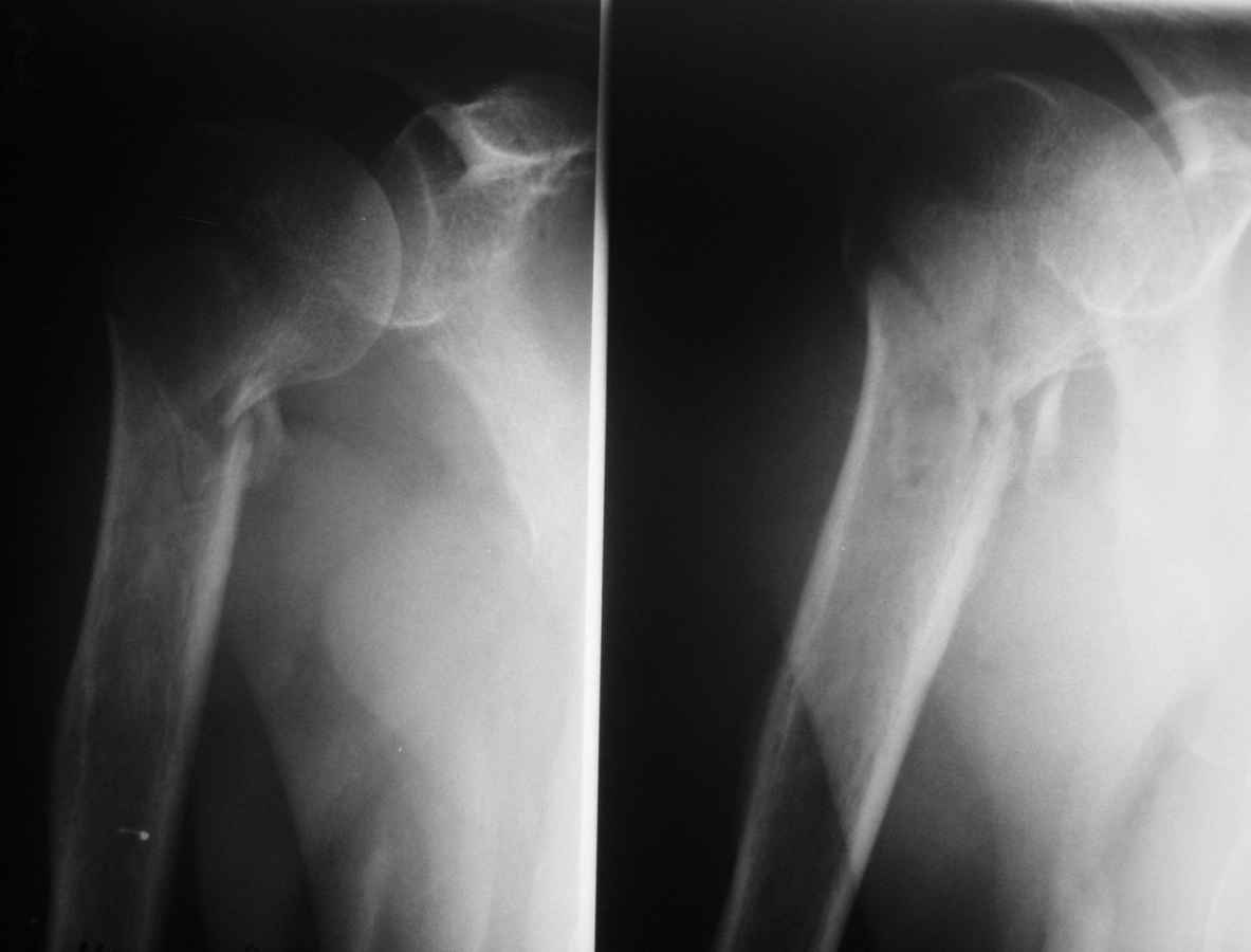 Пациент 55 лет. травма 7.07.09г (первая Р-грамма). Лечился консервативно, надолго выпадал из под наблюдения леч. врача. Последний снимок от 7.08.09 г. Как видно на Р-грамме, стояние отломков неудовлетворительное, клинически выраженная патологическая подвижность. Соп. дз: сахарный диабет 1 типа, средней тяжести.