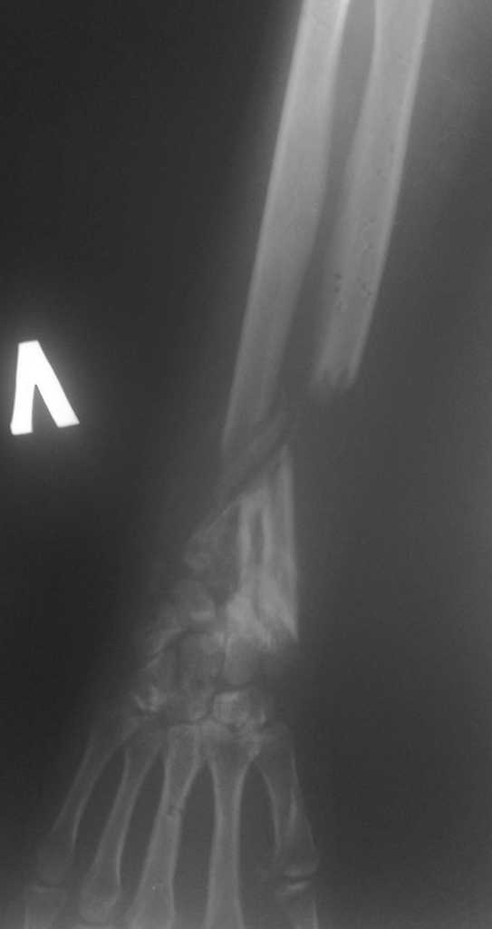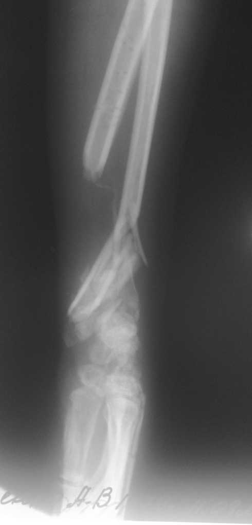 Имеется постттравматический дефект дистальных отделов костей левого предплечья. Больная Д. 30 лет плучила травму 12.07.09г, пассажир скутера - тяжелая сочетанная травма брюшной полости и конечностей, гемоперитониум, закрытый перелом н\3 ЛЕВОГО БЕДРА, открытый перелом н/3 левого предплечья с дефектом обеих костей, рана голени. С момента травмы перелом предплечья был фиксирован анкерно-спицевым апаратом, проводилось лечение других сегментов. В настоящий момент АВФ демонтирован, имеется следующая рентгенологическая картина (см. приложение), имеется дефект обеих костей и суставных поверхностей. Коллеги подскажите варианты лечения в данном случае ?!