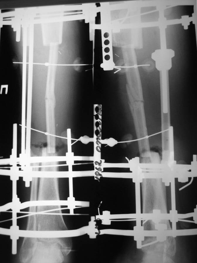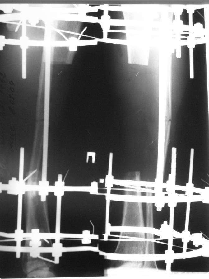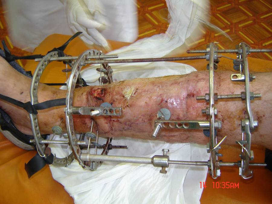 Доброго времени суток. Около двух месяцев назад я писал о пациенте с открытым двойным переломом костей голени, которому в районной больнице производилась открытая репозиция перелома большеберцовой кости с фиксацией металлической пластиной. После нагноения раны металлическая пластина удалена, в рану на большом протяжении обнажилась большеберцовая кость, больной в последующем около 2-х месяцев вёлся на скелетном вытяжении, предпринимались попытки стянуть рану на передней поверхности голени местными тканями путём нанесения параллельных ране разрезов по боковой поверхности голени. К нам он поступил спустя три месяца после травмы с гнойной раной на передней поверхности голени, в которой была обнажена на большом протяжении тусклая большеберцовая кость.На операции в костно-мозговом канале большеберцовой кости гной, кость тусклая. Была произведена резекция участка большеберцовой кости длиной 17 см, пластика дефекта мягких тканей переденей поверхности голени передней большеберцовой мышцей, которой так же укрыт верхний и нижний отрезки большеберцовой кости, мышца закрыта расщеплёнными кожными лоскутами, кости голени фиксированы в аппарате Иллизарова. Послеоперационный период протекал без осложнений, все лоскуты прижились, мелкие раны зажили рубцеванием, воспаления мягких тканей вокруг спиц нет. Недавно оперирован повторно- малоберцовая кость пересечена на уровне верхнего и нижнего отрезков большеберцовой кости, перемещена на область дефекта большеберцовой кости, фиксирована в аппарате. Рентгенснимки и фото голени больного прилагаю. Послеоперационный период протекал без осложнений, раны зажили, швы сняты, больной ходит с полной опорой на ногу в аппарате, воспаления мягких тканей вокруг спиц нет. Планируется постепенное увеличение нагрузки на перемещённую малоберцовую кость путём этапного удаления спиц под рентген контролем. С уважением, Цветков Евгений.
