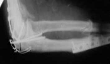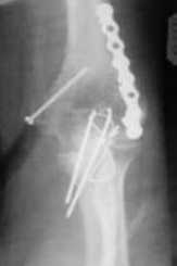 Подскажите пожалуйста, как можно в дальнейшем этому больному помочь. В марте первая операция, пришлось оперировать на 16 сутки в виду инфицированных садин и анемии. Заживление первичным натяжением,раняя разработка после операции, а через 2 нед болевой синдром,и постепенно движения в локтевом суставе ограничились до полного анкилоза. Повторно через 4 месяца вторая операция" артролиз,удаление оссификатов, удаление фиксаторов, реостеосинтез этой же реконструкционной пластиной и винтом" интраоперационно после удаления оссификатов и фиксаторов обнаружил, что перелом не сросшиеся, поэтому пришлось синтезировать заново. Зажило рана первично, объем движений в локтевом суставе сгибание 70, разгибание160, ротационные движения востановились полностью,вроде бы успокоились. Опять постепенно в течении 8 нед после повторной операции постепенно движения ограничились до 80 - 110, на снимке оссификат. Снимки во вложении, буду рад Вашим советам. Спасибо!