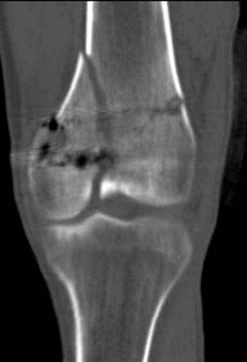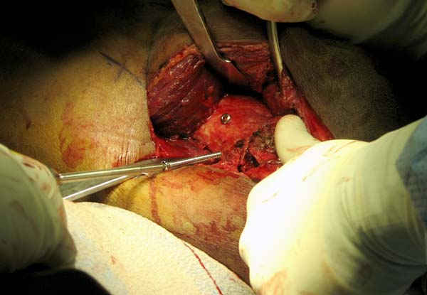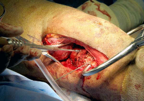 Здесь применен рутинный метод лечения огнестрельных переломов, т.е. рана теоретически чистая, что противоречит принятым ранее догмам . По принятой тактике, при огнестрельных переломах назначаются антибиотики Ancef 1gm каждые 8 часов внутривенно в течение 24 часов. Желательно первую дозу ввести непосредственно перед разрезом.