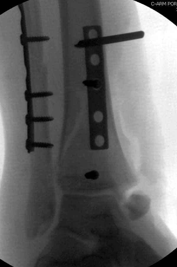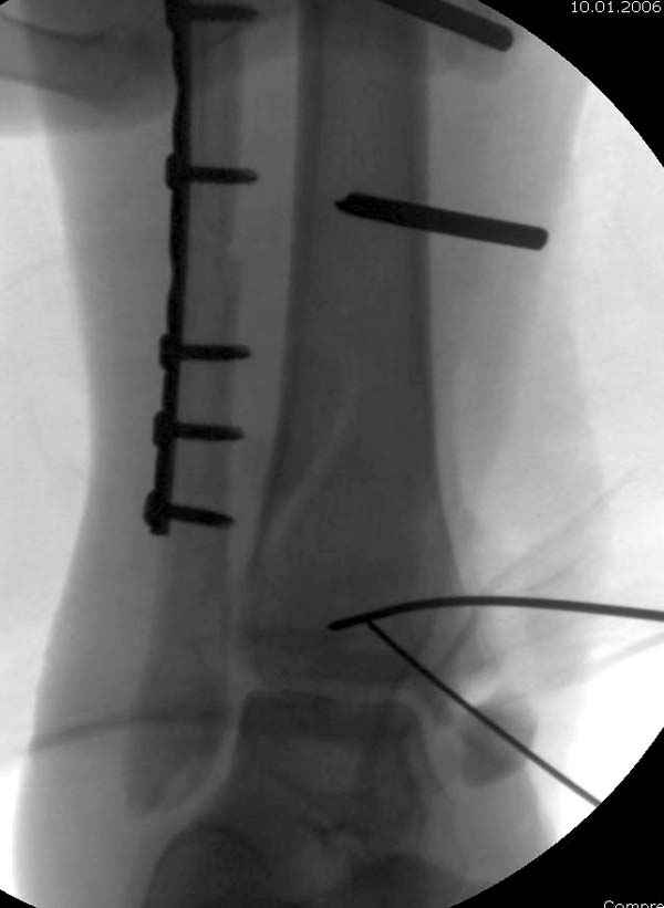 Артродез штифтом от Синтеза - немного агрессивно, а для улучшения качества жизни вместо артродеза голеностопа можно было бы предложить артродез подтаранного сустава. Тремя 6.5 мм каннюлированными шурупами через пятку.