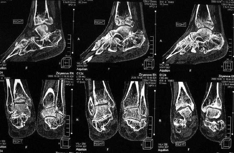 Уважаемые коллеги! Помогите определится с тактикой лечения.Оскольчатый импрессионный перелом заднего края правой большеберцовой (Пилон?) кости 5-ти недельной давности на фоне неправильно сросшихся переломов пяточных костей (травма в 1991г.), ДОА подтаранных суставов 3 ст. До последней травмы больная ходила без особых проблем и работала пекарем (работа на ногах).Суть проблемы в том, что открытая анатомическая репозиция в таком сроке представляется мне крайне травматичной, что может привести к неблагоприятному функциональному исходу.Варианты решения:1) оставить "как есть" с последующим артродезом после развития ДОА2) выполнить остеотомию и попытаться низвести основную часть суставной поверхности3) выполнить попытку анатомической репозиции из задне-латерального??? доступа.