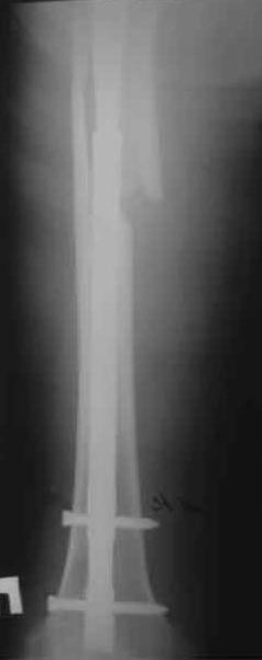 Произведено закрытое удлинение ножки эндопротеза с помощью ретроградного интрамедуллярного стержня. Продолжительность операции 3 часа. Два из них закрытое восстановление длины бедра диистрактором