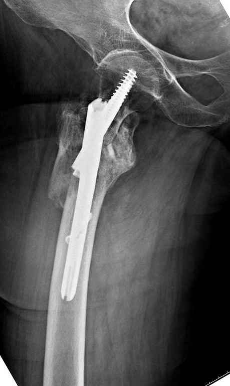 При отсутствии КТ, снимок на вытяжении поможет увидеть общую картину расположения отломков, особенно потенциальные места введения импланта. Риск раскола в этом случае огромный, поэтому больной должен быть дообследован.