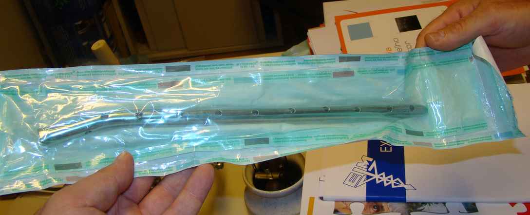 Из вариаций на ту же тему - недавно был в ЦРБ г. Almada (Португалия), где шеф травматологического отделения знакомый многим Nuno C. Lopes. Они там использют гвозди не покрытые, а заполненные цементом с антибиотиком. Для выхода антибиотика наружу в гвозде сделаны не очень многочисленные отверстия. Картинка в приложении.