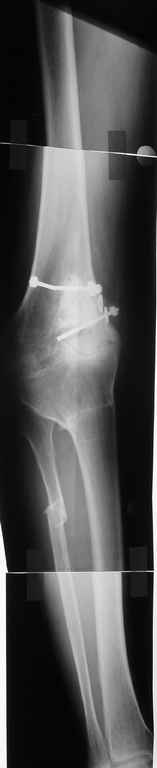 Пациент 59 лет, в 1982 году по поводу остеобластокластомы была выполнена частичная резекция проксимального отдела бедра с пластикой дефекта костно-хрящевым трансплантатом (моноблок)с фиксацией металлическими стяжками. В последующем по поводу деформирующего артроза выполнена корригирущая остеотомия большеберцовой кости. Исход представлен на рентгенограмме. В настоящий момент пациента беспокоят боли в коленном суставе, деформация, и ограничение движений. Варусная деформация коленного сустава 20, движения сгибание 115, разгибание 150, ходит с тростью, выраженная хромота, работа не связана с физическими нагрузками. Правый коленный сустав без патологии. Уважаемые коллеги просим высказать своё мнение - артродез коленного сустава или эндопротезирование.