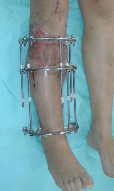 Тогда можно рассмотреть вопрос одновременного удаления штифта, мышечной (в данной области применим проксимально отсеченный лоскут камбаловидной мышцы) или микрохирургической (что более надежно) пластики дефекта мягких тканей, остеотомии проксимального фрагмента большеберцовой кости, остеосинтеза блокируемым штифтом с а/б покрытием, наложения простого аппарата Илизарова (можно из полуколец) для дистракции на штифте. При данном варианте пациент сохраняет возможность полной опоры на ногу, что очень важно для заживления у пожилого пациента) и отпадает необходимость в проведении дополнительный операций (при благоприятном развитии событий).