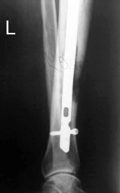 Тогда можно рассмотреть вопрос одновременного удаления штифта, мышечной (в данной области применим проксимально отсеченный лоскут камбаловидной мышцы) или микрохирургической (что более надежно) пластики дефекта мягких тканей, остеотомии проксимального фрагмента большеберцовой кости, остеосинтеза блокируемым штифтом с а/б покрытием, наложения простого аппарата Илизарова (можно из полуколец) для дистракции на штифте. При данном варианте пациент сохраняет возможность полной опоры на ногу, что очень важно для заживления у пожилого пациента) и отпадает необходимость в проведении дополнительный операций (при благоприятном развитии событий).
