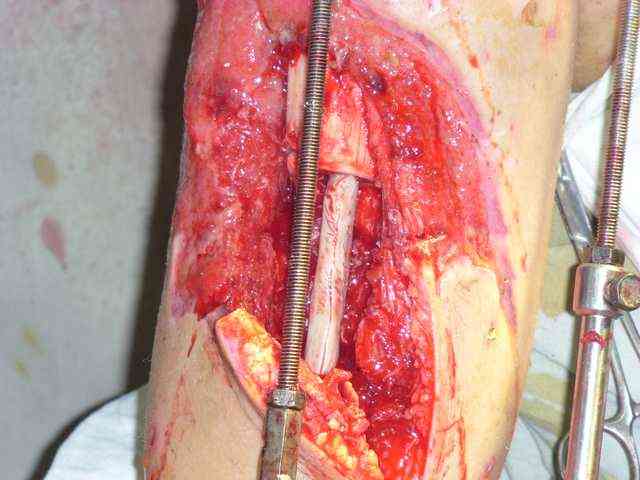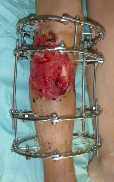 На операции резекция 8 см, внешний остеосинтез,одновременное сближение примерно на 4 см, а затем постепенное сближение до полного контакта в течение 3 недель. Рана с патологически измененными краями, имевшая на операции размеры примерно 4-5 на 10-12 см закрылась самостоятельно в течение примерно 2-х мес. Ну не самостоятельно, конечно, а с нашей помощью, но без пластики.