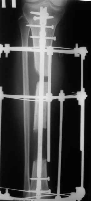 Выкладываю картинки похожей пациентки. Извините, что без окончательных снимков (сейчас их нет под рукой). Правда мы имели проблемы у данной больной после снятия аппарата, когда промежуточный фрагмент большеберцовой кости сместился на 1,5 см дистально и отошел от проксимальной части кости. До сих пор у пациентки на снимках определяется лишь тонкая полоска кости по задней поверхности за штифтом (образовалось что-то вроде маленького регенерата)в области стыковки промежуточного и проксимального фрагментов. Больная пока решила подождать. Не хочет оперироваться, так как ходит не хромая, работает.