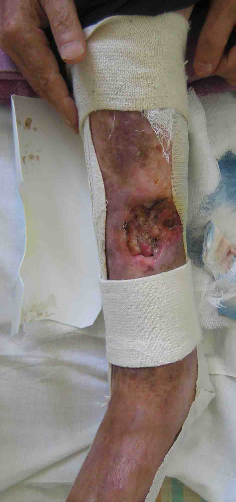 Кратко: мужчина за 60 лет получил травму 28 лет назад (переехало автобусом). Оперировался десятки раз, в итоге с очередным патологическим переломом, хронической язвой и гипсовой лонгетой попал ко мне... Объективно - остеомиелит, инфицированный ложный сустав (или как его назвать), флегмона по наружной поверхности