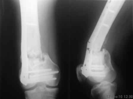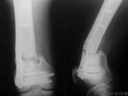 На сегодняшний день наступил перелом пластины, укорочение бедра 2 см. Перелом шейки клинически и рентгенологически сросся. Больной астеничен, немного анемичен. Рентгенограммы прилагаются.