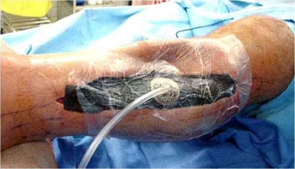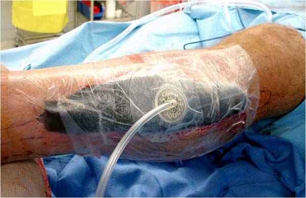 После расширенного доступа к фасции, разрез закрываем ваккуумной повязкой (VAC), которая облегчает уход и предупреждает осложнения. Вакуумирование уменьшает дальнейшее сокращение кожи и облегчает закрытие раны.